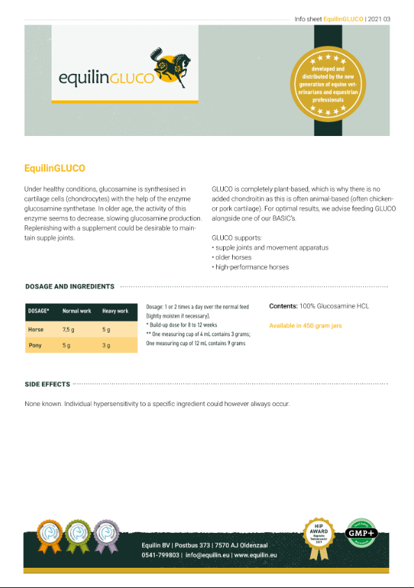 Supplement met volledig plantaardige Glucosamine HCL. GLUCO biedt extra ondersteuning voor soepele gewrichten of bij oudere paarden. Glucosamine is een lichaamseigen stof die zorgt voor de smering van het kraakbeen. Voor een optimaal resultaat voeren in combinatie met één van de BASIC’s.