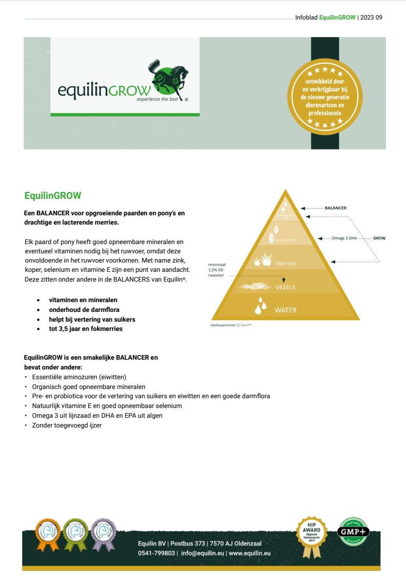 EquilinGROW, een BALANCER voor opgroeiende paarden en pony’s en drachtige en lacterende merries. Kijk voor meer informatie over de producten uit dit pakket bij de desbetreffende producten.