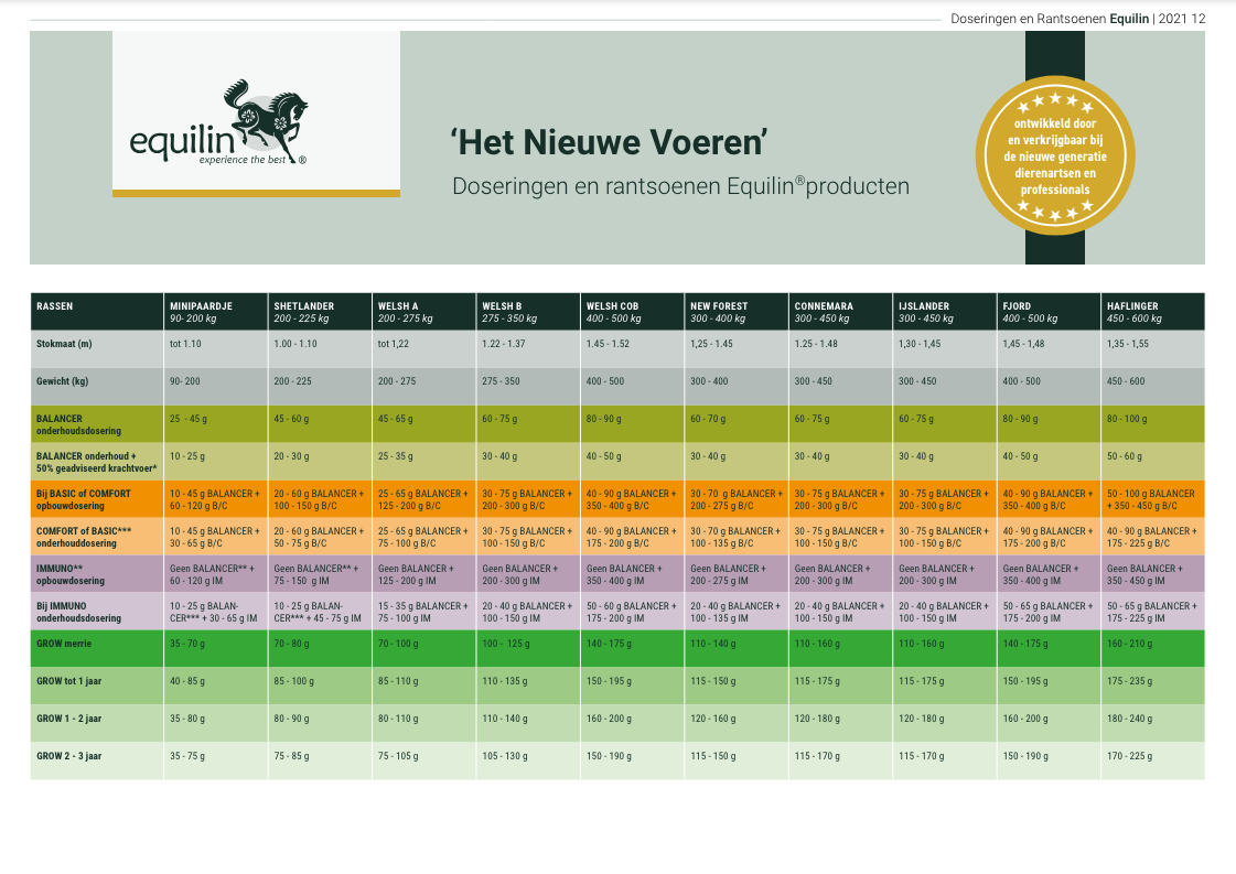 Download het schema met doseringen en rantsoenen van Equilin® producten.